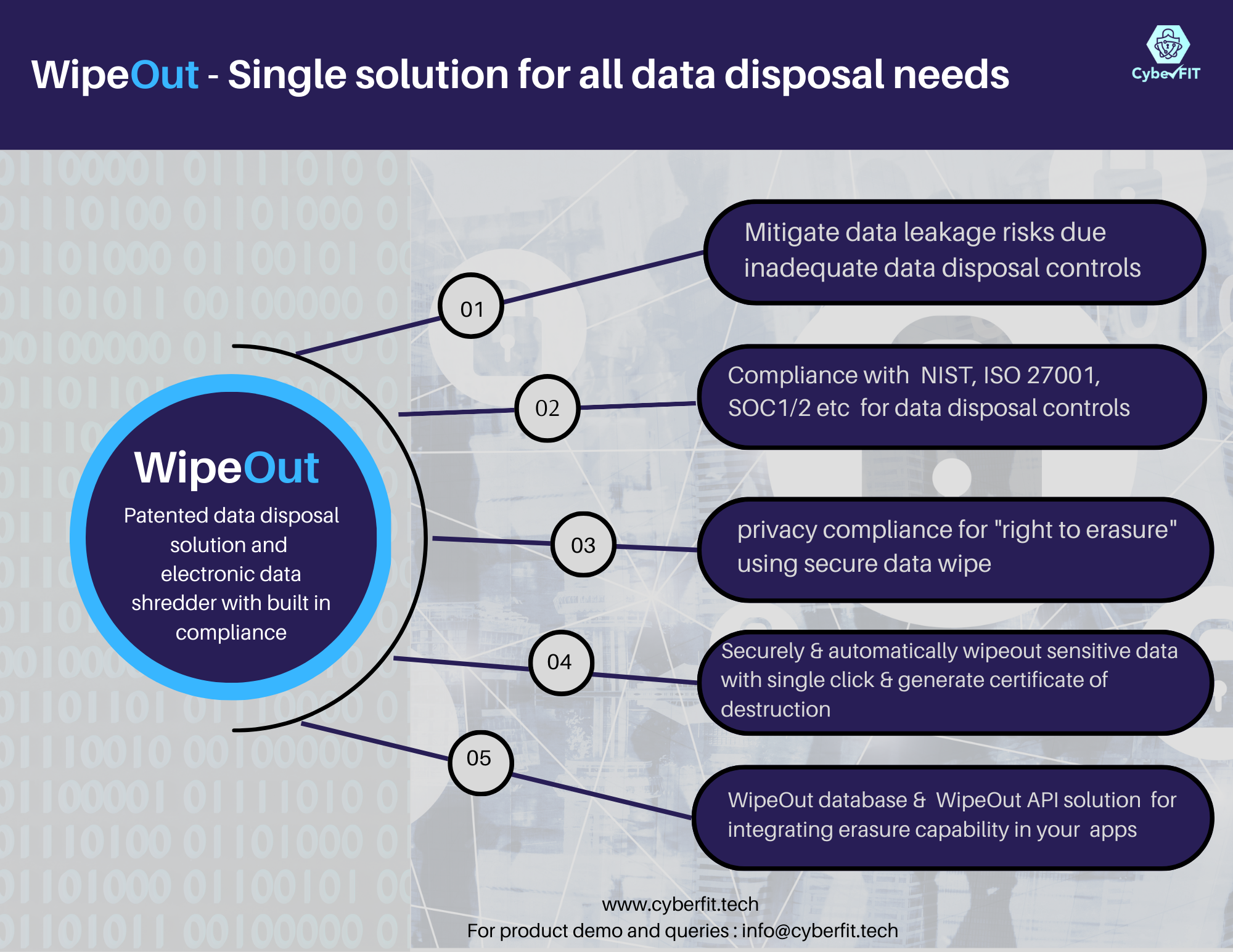 Wipeout , a patented solution by CyberFIT, is an electronic data shredder with built in compliance for data disposal solution. Wipeout offers a series of products such as Wipeout for systems, database wipeout, WipeOut as a series, Wipeout API and so on. CyberFIT focuses on secure data erasure to prevent data leakage risks arising from inadequate data disposal controls. Today, IS and privacy regulations require companies to implement safe data disposal methods to ensure confidential and personal data (PII, source code, internal documents etc) are protected during data disposal stages.