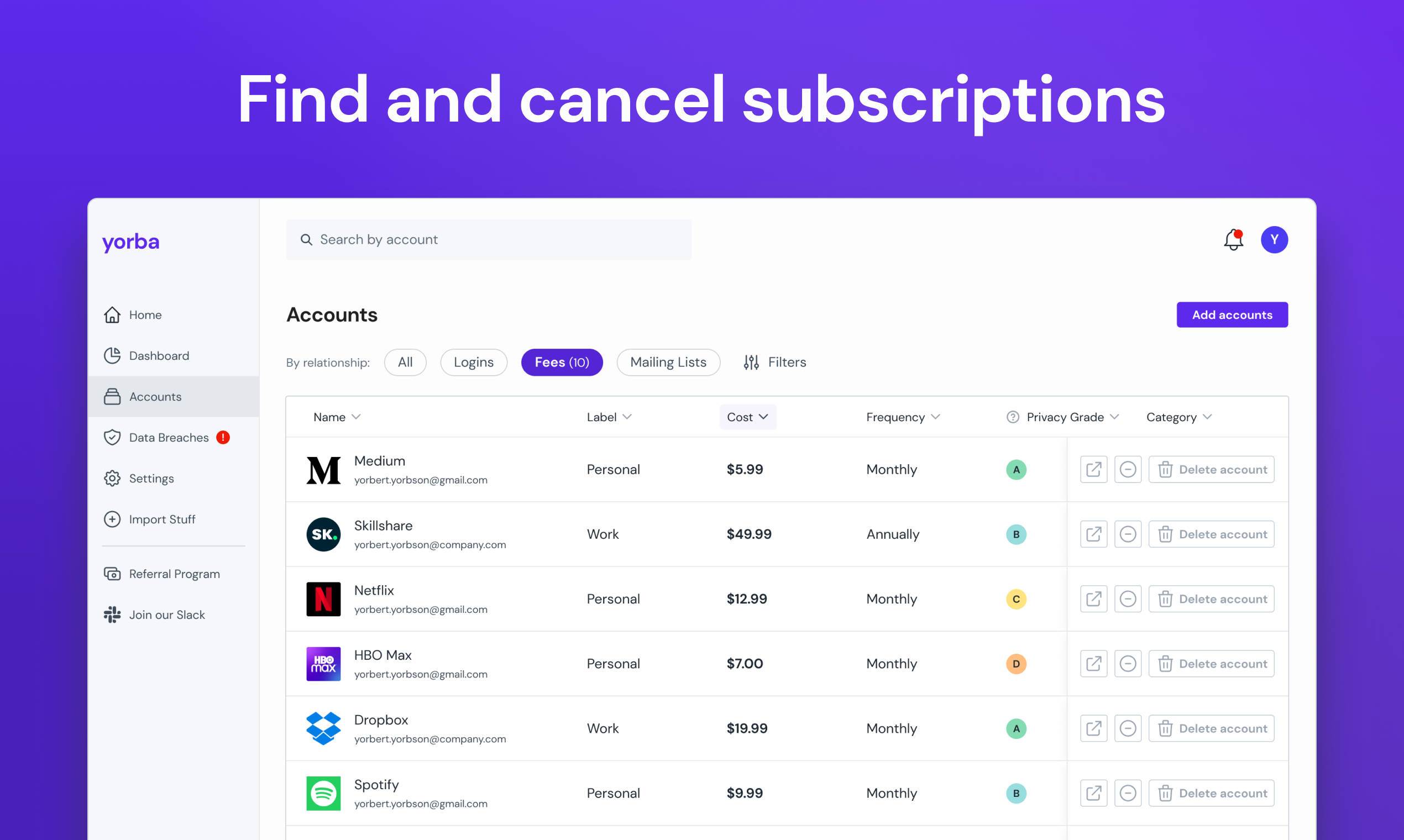 Beyond subscription tracking, Yorba offers a range of tools that help individuals get greater control over their data. These include monitoring for data breaches users could be affected by and assisting with finding and deleting unused accounts, making it easier to keep personal information safe. Yorba’s commitment to user privacy means a completely ad-free experience and full control over personal data.