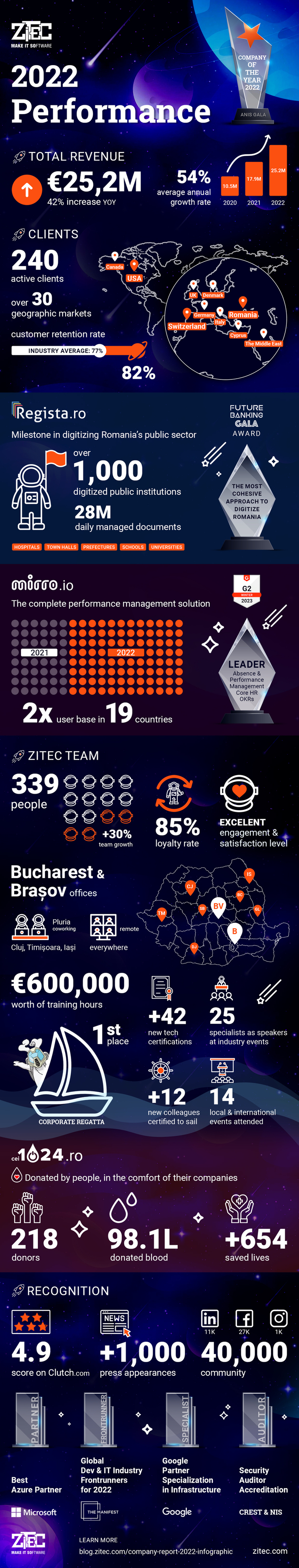For 2022, Zitec reported a customer retention rate of 82%, exceeding the 77% industry average for IT & Software, 45 new customers, and €25.2 million in revenue, an increase of 42% compared to the previous year. Zitec now caters to 240 companies in over 30 countries, making use of its extensive 20 years of experience in technology and development to help them seize the value of digital transformation: operational efficiency, faster time to market, and meeting customer expectations.