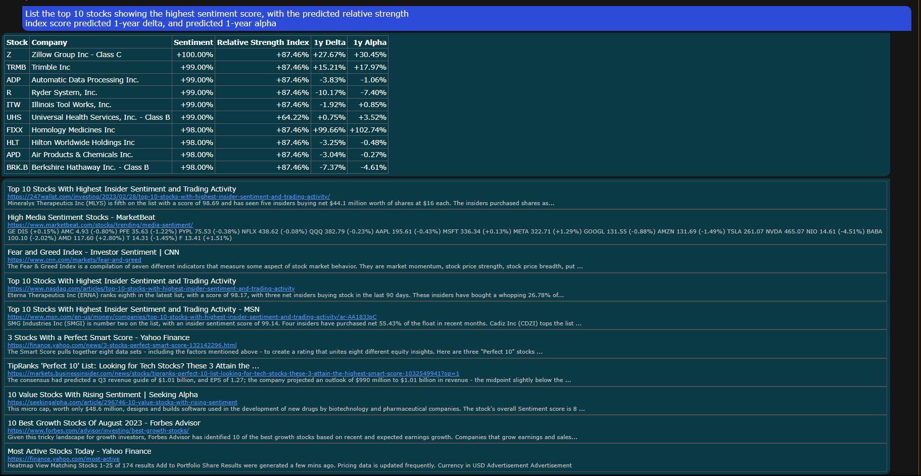 4. Sentiment Analysis: Users can utilize sentiment analysis generated from over 3,000 news feeds to assess market sentiment towards specific stocks and ETFs, facilitating the creation of well-informed strategies.